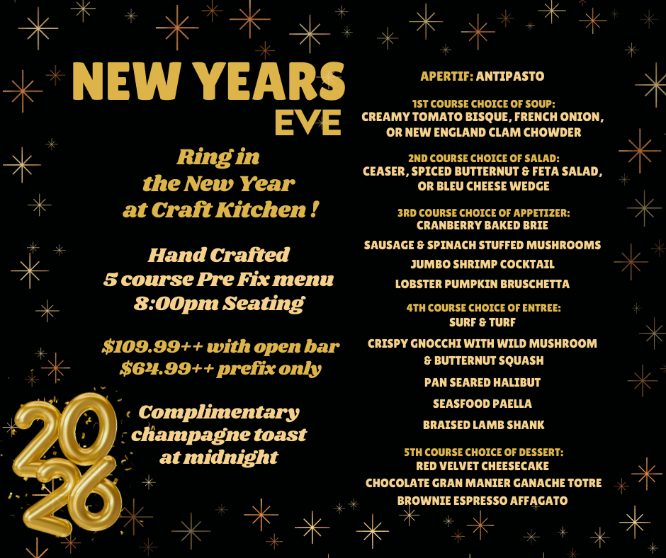 Ring in the New Year with us at Craft! An unforgettable New Year’s Eve celebration designed to delight and create memories that last a lifetime. Enjoy chef-crafted multi-course pre fix menu featuring the freshest seasonal ingredients, optional open bar packages, and delectable house made desserts. Our expert mixologists will be presenting a selection of signature cocktails, premium spirits, and a champagne toast at midnight.